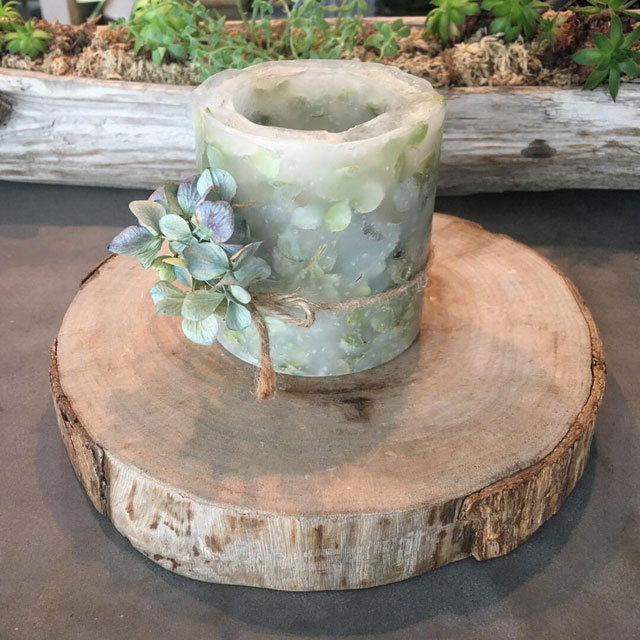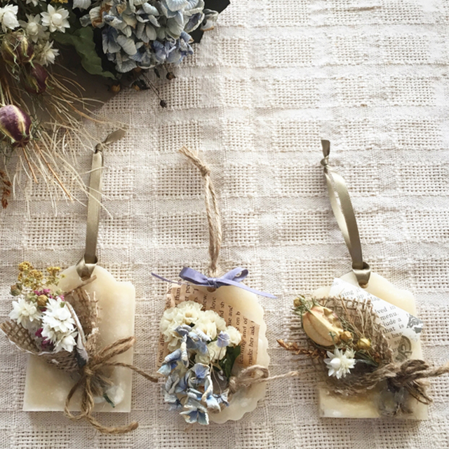 アロマオイルで香りづけした蝋を型に流し込み、ドライフラワーなどのデコレーション材料で飾り付けして固めて作ったもの。