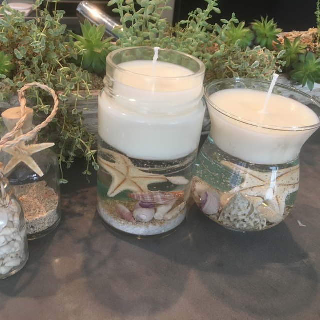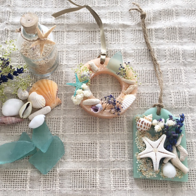 夏のインテリアには貝や天然石などの涼しげなものを入れて制作し、季節感を出すこともできます。